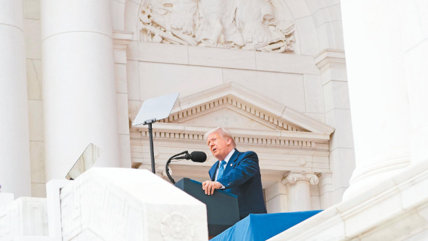 ▲特朗普在“國殤日”到阿靈頓國家公墓悼念陣亡軍人,并發(fā)表演說,鞭撻政敵,批評前朝政府管治不力。 美聯(lián)社