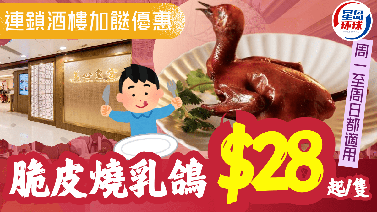 美心集團(tuán)旗下的餐廳不時(shí)會推出優(yōu)惠回饋食客,例如有早前北京樓的6折片皮鴨4人餐,以及$68單人餐及85折加餸等。 近日,主打精致粵菜的中菜廳美心皇宮及映月樓就推出晚市“加餸”優(yōu)惠,脆皮燒乳鴿堂食每只低至$28,就算周末都供應(yīng),非常抵食。