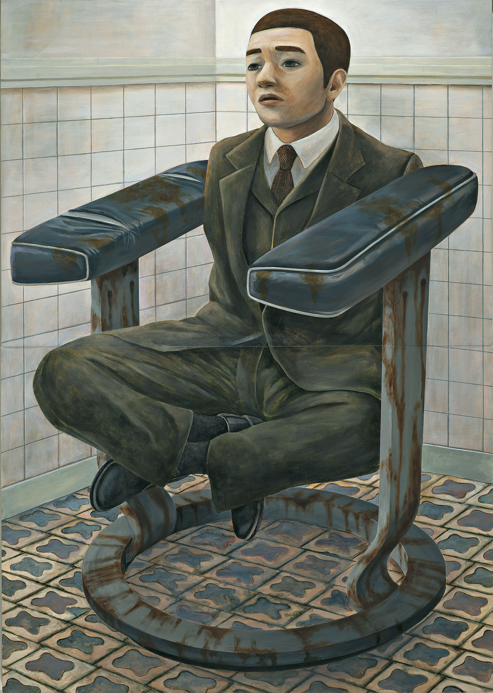 說回今次的焦點(diǎn)拍品《空置大廈內(nèi)的經(jīng)理座位》,乃是石田徹也的代表作之一,以超現(xiàn)實的手法創(chuàng)作,畫中描繪一位經(jīng)理化身為人肉椅子的荒誕場景,藉以諷刺職場階級制度與人性的異化。西裝革履的經(jīng)理盤腿化作一張破舊的椅子,雙臂與金屬支架詭異融為一體,眼神空洞、表情麻木,象征階級社會中個體的卑微與無力。經(jīng)理的形象既是壓迫的承受者,也是施壓者,反映人在階級結(jié)構(gòu)中的多重角色。畫面背景的空置大廈與老化的椅子,進(jìn)一步強(qiáng)化社會的荒涼與無價值感。