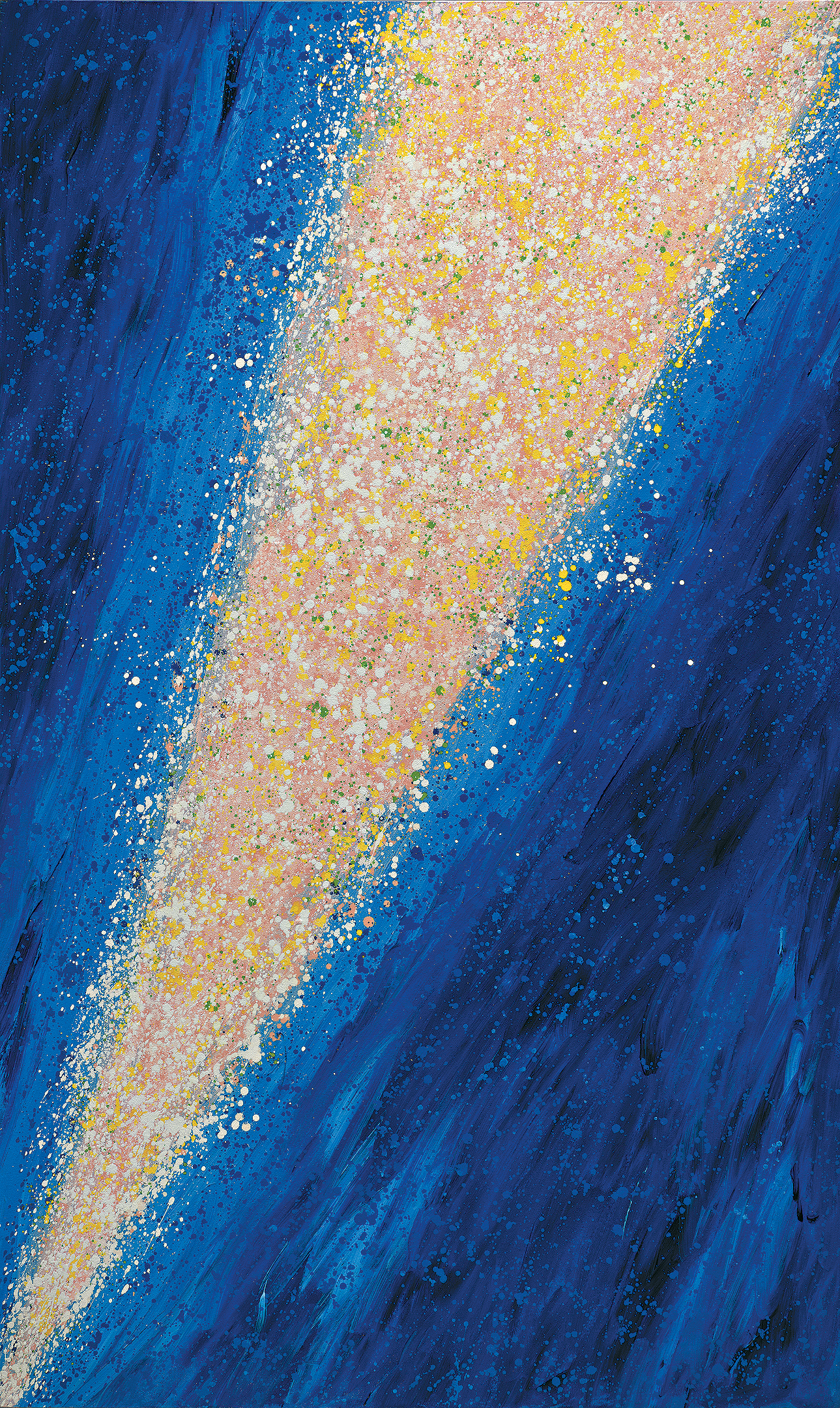 今次拍賣的另一焦點(diǎn)是來自上海的抽象藝術(shù)大師蕭勤作品《彗星-5》(2002年),他師從朱德群,后負(fù)笈歐洲,作品融合東方美學(xué)及西方抽象表現(xiàn)主義。1980年代,他以彗星、大漩渦、星河等宇宙景觀創(chuàng)作“宇宙風(fēng)景”系列。千禧年后,他重返此主題,探索宇宙萬物的能量與深邃意蘊(yùn),《彗星-5》便是其中之一。此巨幅高達(dá)兩米,靛藍(lán)背景中白色彗星對角劃過,強(qiáng)烈的冷暖對比體現(xiàn)道家陰陽哲思,隱喻生命如彗星般短暫卻璀璨,構(gòu)圖充滿動感和張力。