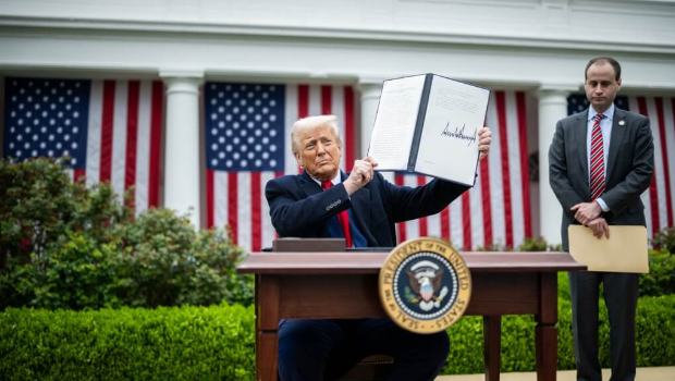 ▲圖為美國總統(tǒng)特朗普(中)4月2日宣布對各國開征對等關(guān)稅。(圖取自x.com/WhiteHouse)