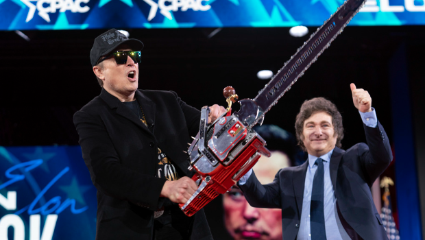 馬斯克手持阿根廷總統(tǒng)米雷伊(右)相贈的電鋸,宣稱要“??彻倭胖髁x”