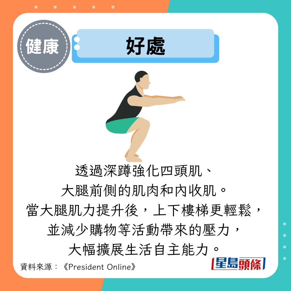 鐮田實醫(yī)生表示,深蹲運動每天都可以輕松進(jìn)行,并能有效鍛煉強(qiáng)壯的腿部和臀部,使其成為任何年齡層身體健康的基礎(chǔ)。 特別推薦透過深蹲強(qiáng)化四頭肌、大腿前側(cè)的肌肉和內(nèi)收肌。 當(dāng)大腿肌力提升后,上下樓梯更輕松,并減少購物等活動帶來的壓力,大幅擴(kuò)展生活自主能力。 深蹲時伸展的股四頭肌能充分釋放肌動蛋白,兼刺激大腦分泌腦源性神經(jīng)營養(yǎng)因子(BDNF),有助預(yù)防腦退化癥。