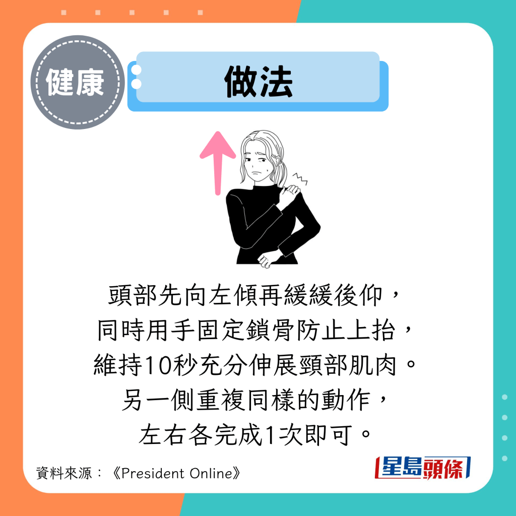 頭部先向左傾再緩緩后仰,同時用手固定鎖骨防止上抬,維持10秒充分伸展頸部肌肉。