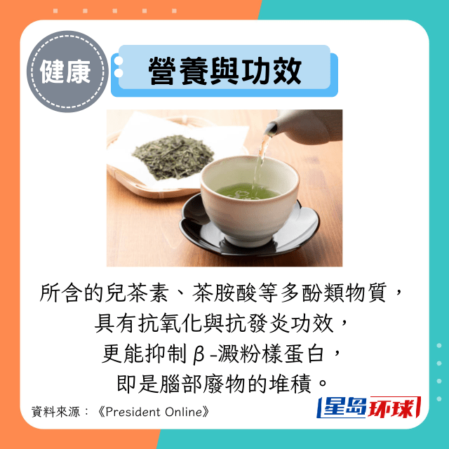原因:綠茶所含的兒茶素、茶胺酸等多酚類物質(zhì),具有抗氧化與抗發(fā)炎功效,更能抑制β-淀粉樣蛋白,即是腦部廢物的堆積,有助預(yù)防腦退化癥。