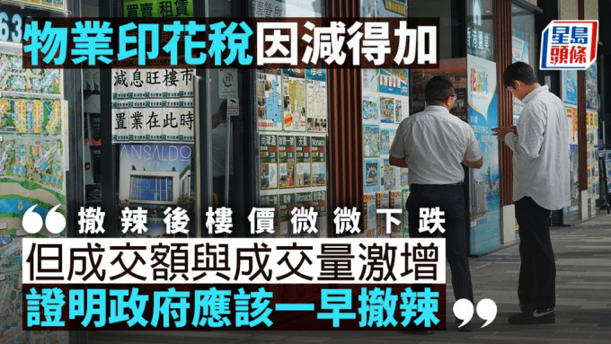 而市民叫政府唔撤辣最大理由,就是撤辣后樓價(jià)飆升,而事實(shí)勝于雄辯,樓價(jià)不但沒(méi)有上升,甚至微微下跌,但成交額與成交量都激增,這證明政府應(yīng)該一早撤辣,在財(cái)赤下,增加200幾億印花稅是雪中送碳,估計(jì)今年物業(yè)印花稅收入會(huì)繼續(xù)上升,很多人好奇怪,點(diǎn)解撤辣反而會(huì)令物業(yè)印花稅收入增如,理由很簡(jiǎn)單,就是辣招稅令買樓的人減少,稅收自然減少,撤辣后買樓的人增加,稅收自然增如。