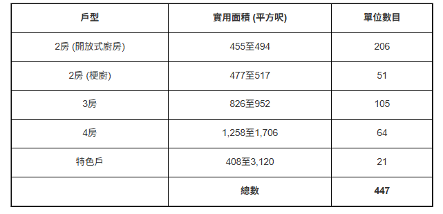 根據(jù)樓書(shū)資料顯示,項(xiàng)目共提供447個(gè)單位,戶型由2房至5房間隔,面積介乎408方呎至3120方呎。其中,標(biāo)準(zhǔn)戶型提供426伙,面積由455方呎至1706方呎;特色戶則提供21伙,面積由408方呎至3120方呎。當(dāng)中2房占近60%,3房及4房大戶合共占約40%,5房戶則只有2伙。