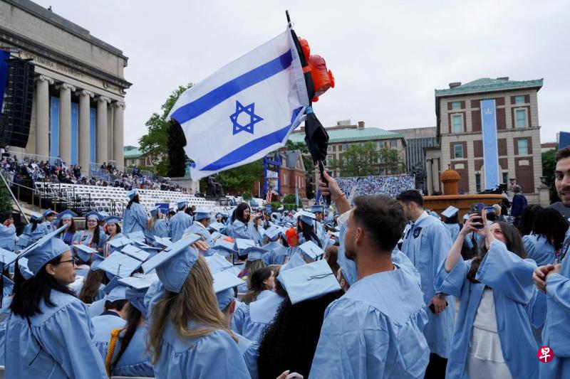 ▲今年5月21日,美國(guó)紐約市曼哈頓哥倫比亞大學(xué)主校區(qū)畢業(yè)典禮上,一名學(xué)生手持以色列國(guó)旗。路透社