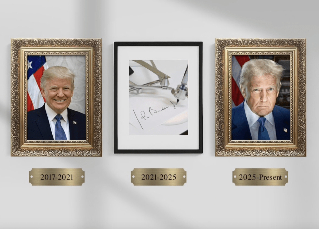今年3月,特朗普曾在其社交平臺(tái)發(fā)布一張圖片,圖中包含其第一和第二任期的官方肖像照,中間放置一張拜登的自動(dòng)簽名筆。FOX新聞網(wǎng)報(bào)道稱,特朗普此舉諷刺拜登使用自動(dòng)簽名筆履職。