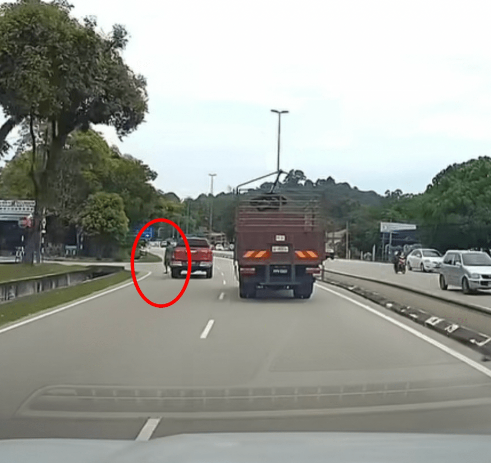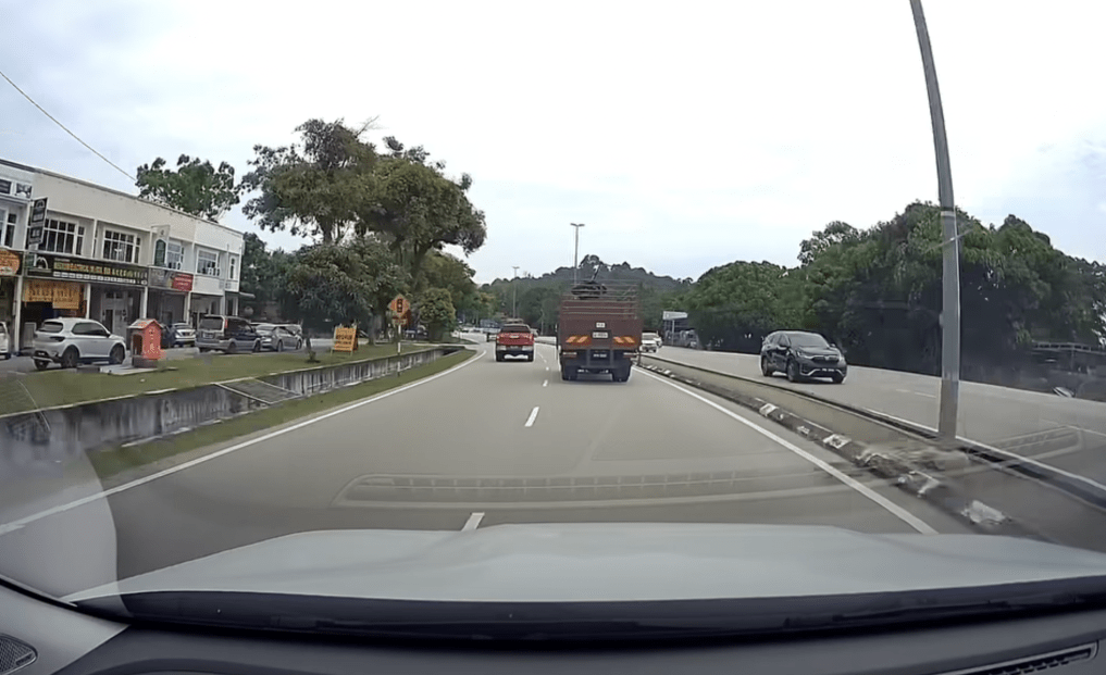 從車cam片畫面顯示,事件發(fā)生于5月30日下午1時許,當(dāng)時車主在檳城某公路上行駛,前面是一架大貨車和一輛紅色四驅(qū)車。