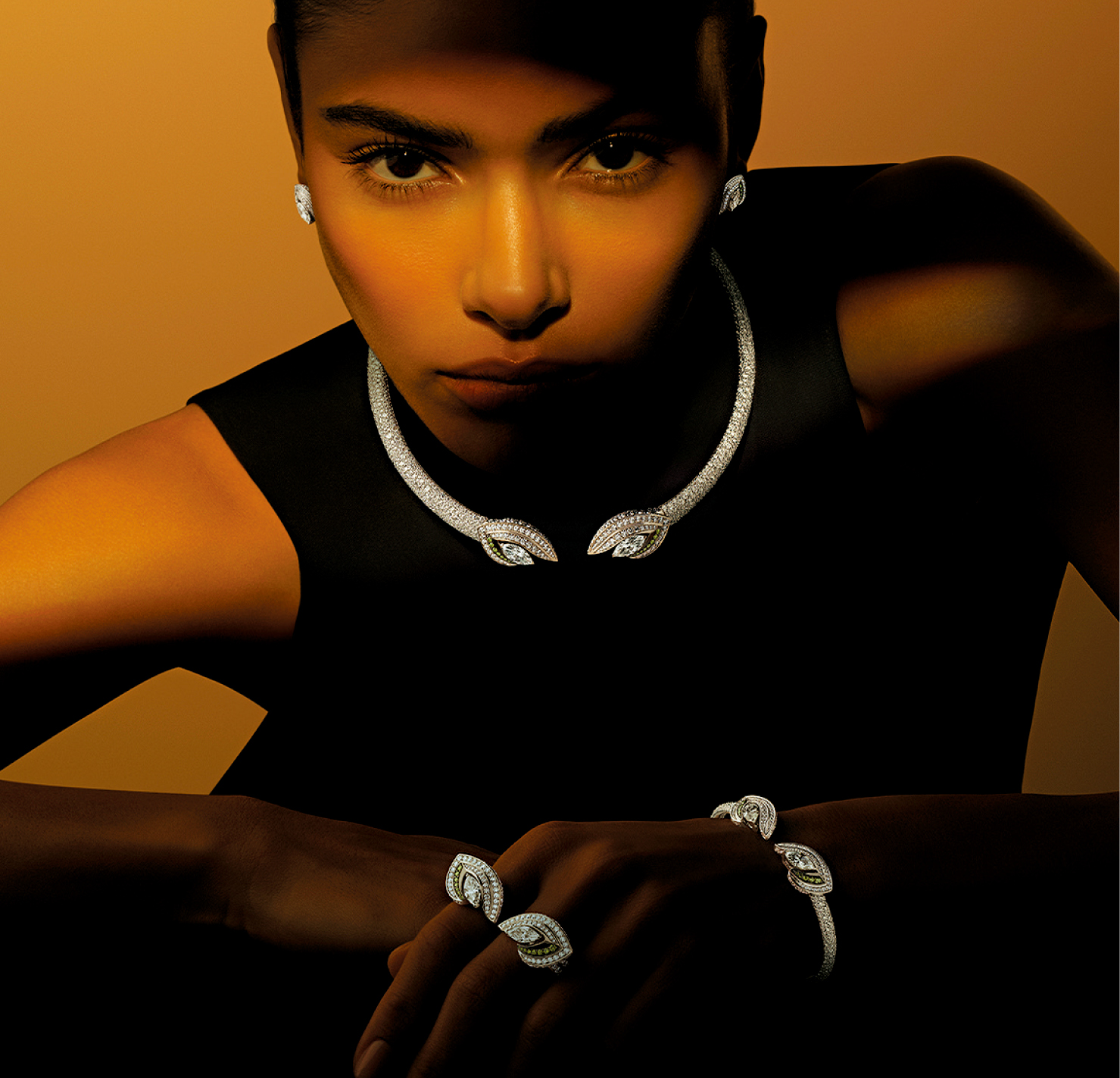 Magnetism套組共有7件作品,以流麗曲線結(jié)合鏤空設(shè)計(jì)以模仿豹紋,而黑色鍍銠金屬中的珍稀橄欖綠鉆石,則是豹的迷人眼睛。