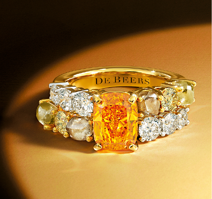 作為鉆石的先導(dǎo)者,新系列亦包含珍稀的鉆石與寶石,其中兩枚矚目指環(huán)包括Dignity Masterpiece及Protection Masterpiece鉆石指環(huán),均鑲嵌了出自De Beers Natural Works of Art系列的鉆石,如前者便鑲嵌單顆重2.03卡的艷彩枕形切割橘鉆,其售價(jià)是全場(chǎng)之冠。