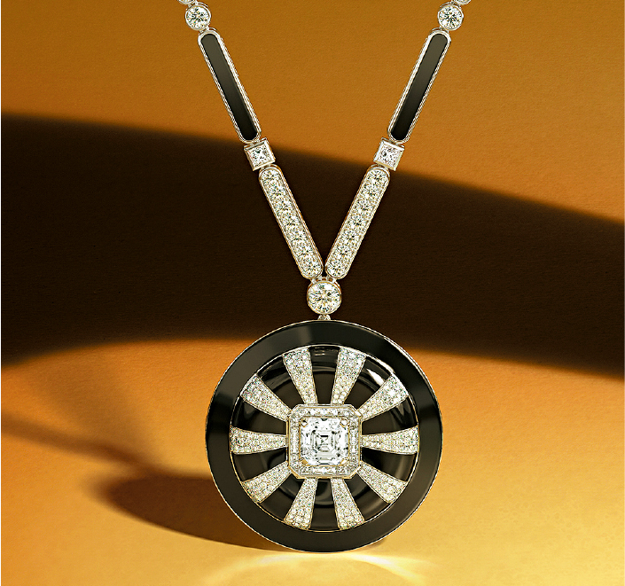 ▲Individuality圓牌吊墜項(xiàng)鏈以鉆石和黑漆抽象地呈現(xiàn)斑馬的黑白線條,圓牌鑲嵌一顆2.01卡方形切割鉆石。