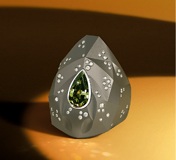 ▲Fortitude圖章指環(huán)以犀牛為設(shè)計(jì)靈感,鑲鉆的刻面鈦金屬嵌套著單顆暗彩帶綠色的黃鉆。