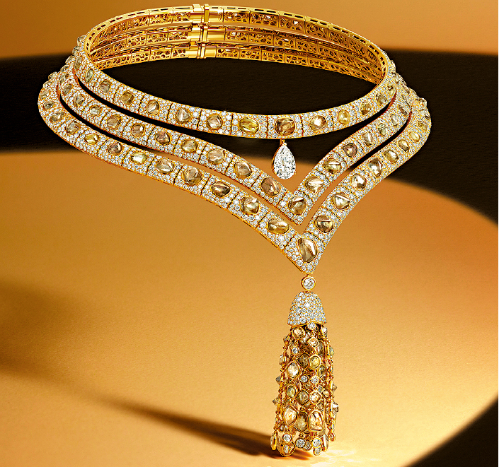▲Dignity流穗項(xiàng)鏈密鑲白鉆和色澤濃郁的褐色鉆石原石,重現(xiàn)長(zhǎng)頸鹿的斑紋。三條項(xiàng)鏈及流穗部分都可分拆下來,帶來多變佩戴方式。