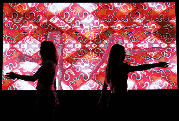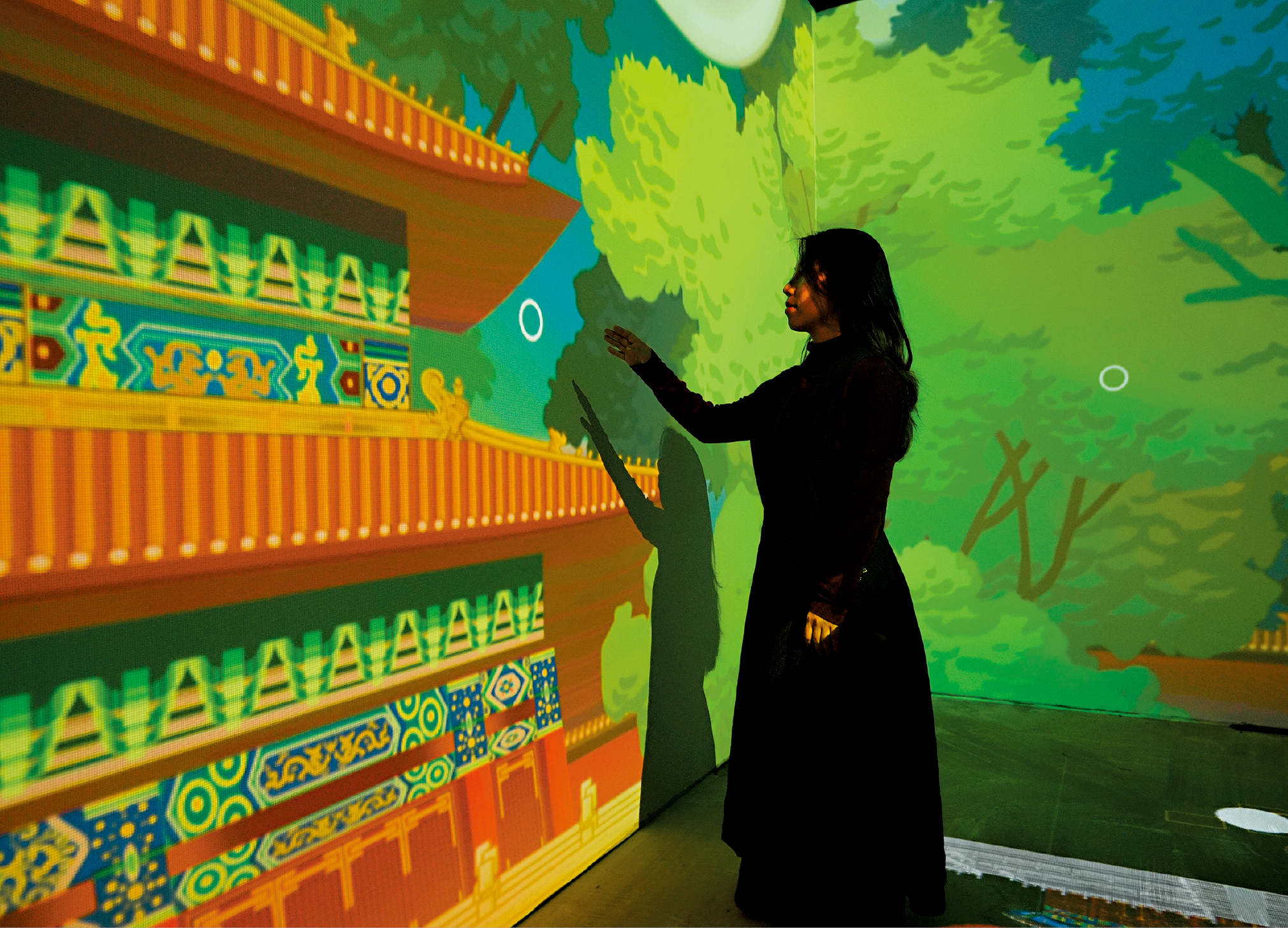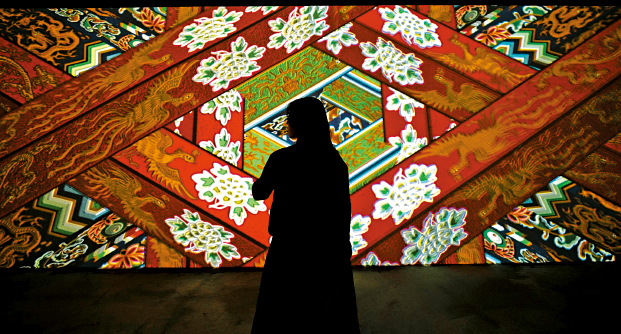 在“城市哲學(xué)”篇章中,觀眾可站立于中央的渾天儀裝置內(nèi),腳踏四象徽記,觸發(fā)全息投影,感受星宿與北京城的聯(lián)系;“城市架構(gòu)”篇章中,觀眾可步行于地面投影的中軸線縮略示意圖上,了解建筑冷知識與動態(tài)氣象;而在“城市紋理”篇章,只要踩踏地面即可激活出中軸線建筑的藻井和彩繪圖案,讓觀眾彷彿置身于千年古建筑。