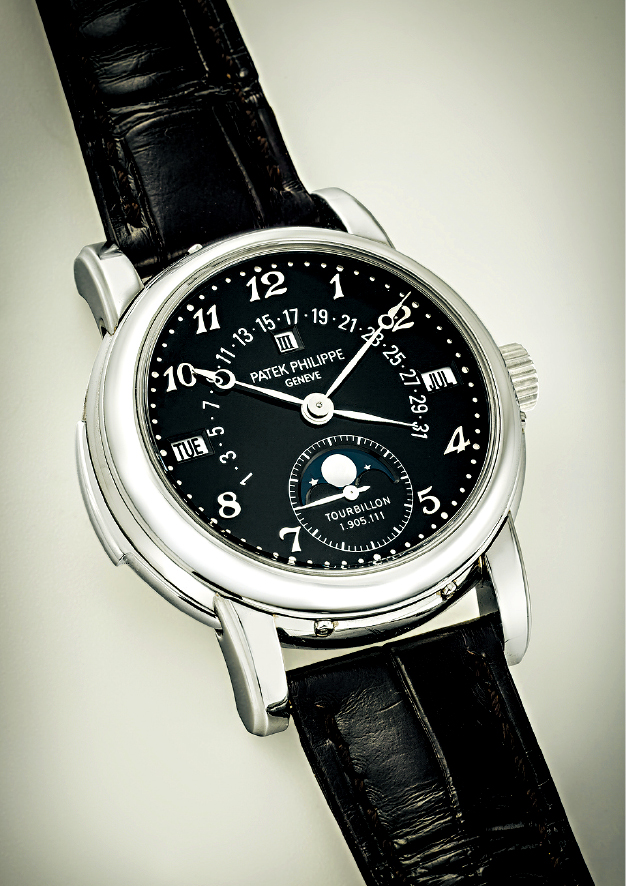 ▲Patek Philippe鉑金黑色表盤三問萬年歷腕表,型號5016P-018,約2009年制。