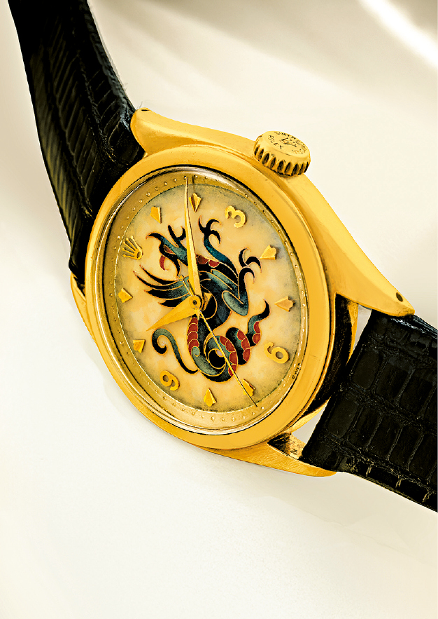 ▲Rolex King's Art Collection 18K金自動上弦型號6100腕表,配琺瑯表盤抽繪龍,約1954年制。