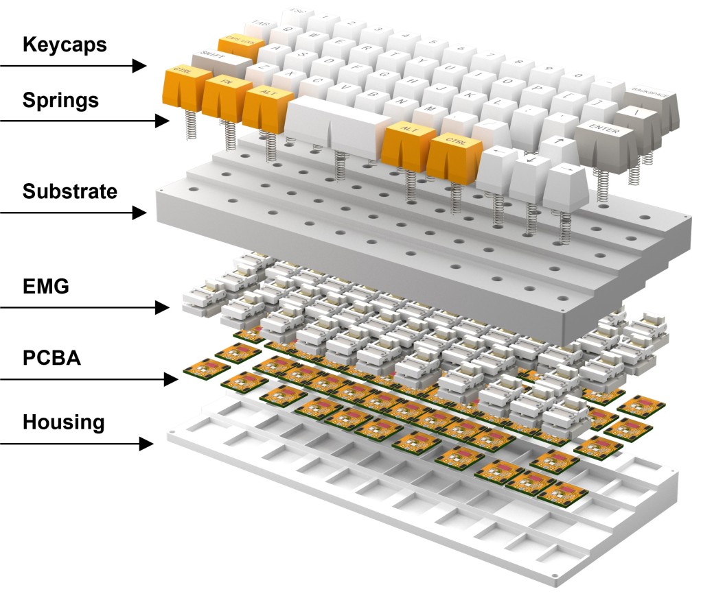 ▲“無電池?zé)o線鍵盤”通過“動(dòng)能—電能”轉(zhuǎn)換技術(shù),將用戶每次按鍵的動(dòng)能直接轉(zhuǎn)化為供鍵盤運(yùn)作及傳輸訊號(hào)的電能。中大提供