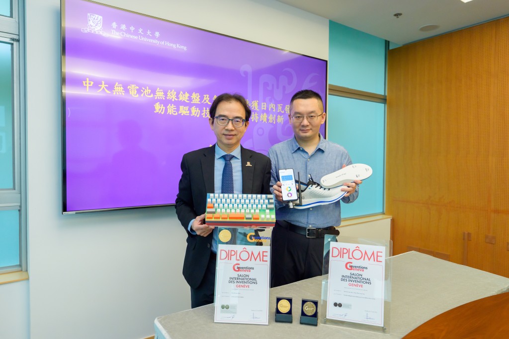 廖維新(左)和李鑫(右)的團(tuán)隊(duì)成功研發(fā)出“無電池?zé)o線鍵盤”及“無電池智能鞋墊”,并在第50屆日內(nèi)瓦國(guó)際發(fā)明展分別獲頒評(píng)審團(tuán)嘉許金獎(jiǎng)及銅獎(jiǎng)。中大提供