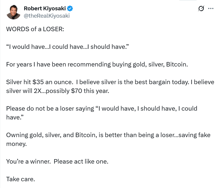 ▲《富爸爸,窮爸爸》作者羅伯特清崎指,數(shù)十億美元資金正涌入黃金、白銀及比特幣,認為白銀今年內(nèi)將倍升至每盎司70美元。