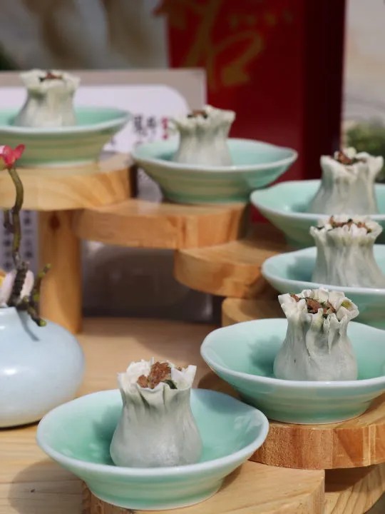 中國(guó)淮揚(yáng)菜博物館的鴻運(yùn)糯米糍呈祥云造型,色澤明艷,入口綿柔;龍虎斗燒麥雙色雙味,形制別致,令人賞心悅目。趣園茶社的豌豆紅薯芝士包將豌豆、紅薯、芝士巧妙搭配,咸甜交融,回味悠長(zhǎng);翡翠松茸小籠包用蔬菜汁和面,松茸入餡,清香四溢,滋味鮮美。