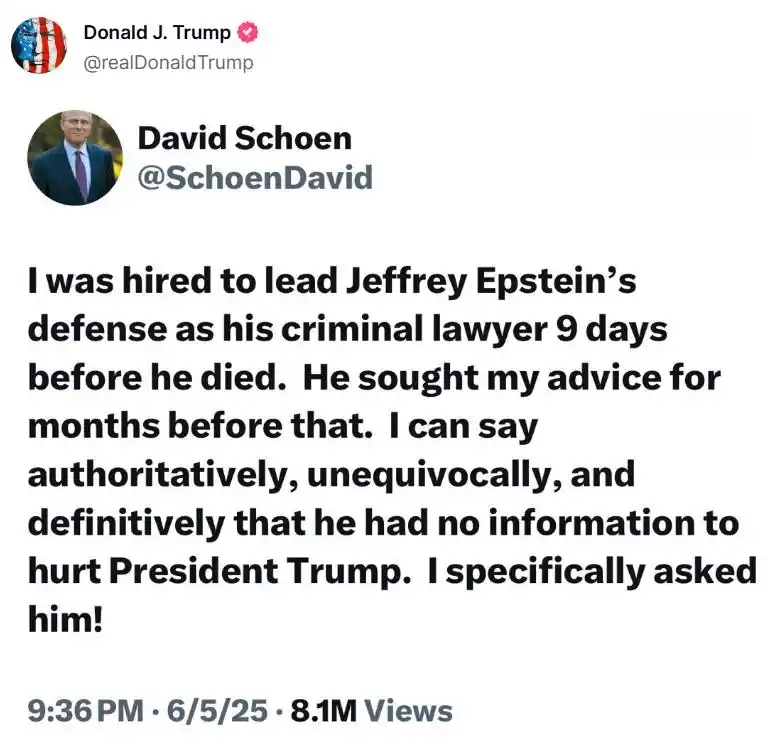 據(jù)環(huán)球網(wǎng)報(bào)道,特朗普當(dāng)天在其自創(chuàng)社交平臺(tái)上發(fā)出一張圖片,圖中是律師大衛(wèi)·舍恩的言論,舍恩曾在愛潑斯坦死亡前不久被聘為其首席辯護(hù)律師。舍恩稱,“在杰弗里·愛潑斯坦去世前9天,我受聘成為他的刑事律師為他辯護(hù)。在此之前的幾個(gè)月里,他一直在征求我的意見。我可以權(quán)威地、明確地、肯定地說,他(愛潑斯坦)沒有任何可以傷害特朗普總統(tǒng)的信息。我特意向他核實(shí)過!”