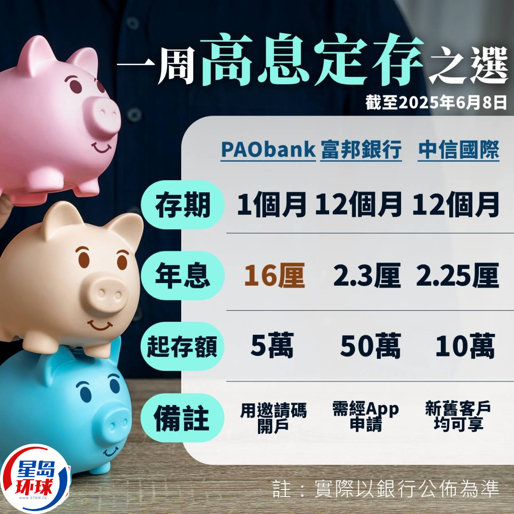【定期存款/定存/高息定存】香港銀行同業(yè)拆息(Hibor)稍回穩(wěn),雖然1個(gè)月拆息上周五僅約0.64厘,但按周微升5點(diǎn)子,3個(gè)月及12個(gè)月拆息亦分別按周回升至1.73及3.08厘水平,而富邦、信銀、天星及華僑銀行等均見調(diào)高定存息率。值得注息的是,PAObank近日推出港元定存優(yōu)惠,新客1個(gè)月息率高達(dá)16厘,起存額僅100元。另一方面,特朗普再向鮑威爾施壓、甚至要求大幅減息1厘,但市場(chǎng)仍預(yù)計(jì)聯(lián)儲(chǔ)局于6月17日至18日議息中維持利率不變;美元定存則仍普遍較港元定存高息,其中富邦3個(gè)月美元定存可達(dá)4.3厘。