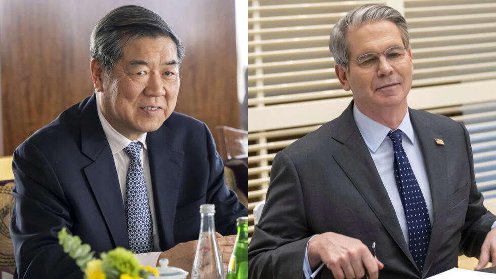 ▲中美再就經(jīng)貿(mào)問題舉行會談。圖為何立峰(左)和美國財長貝森特早前在日內(nèi)瓦會談。美聯(lián)社