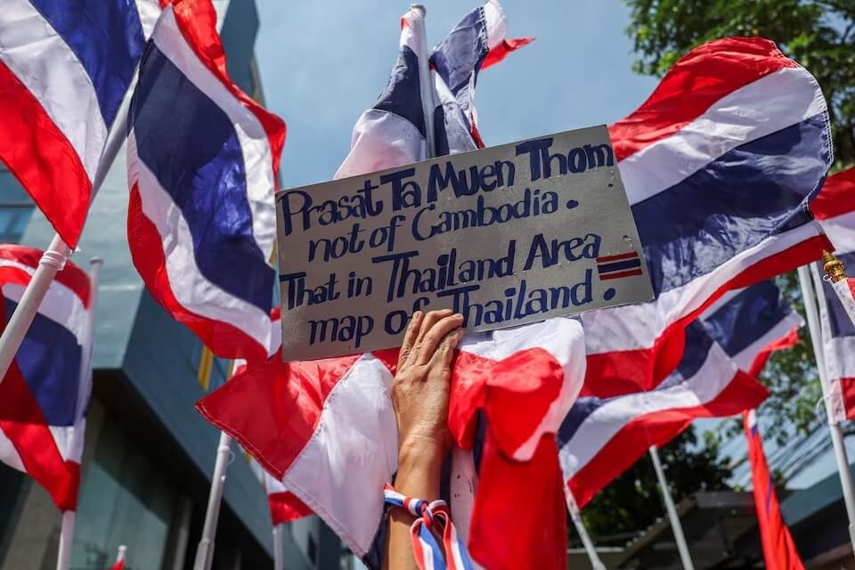 ▲5月28日泰柬邊境沖突后,抗議者在柬埔寨駐泰大使館前舉牌。(路透社)