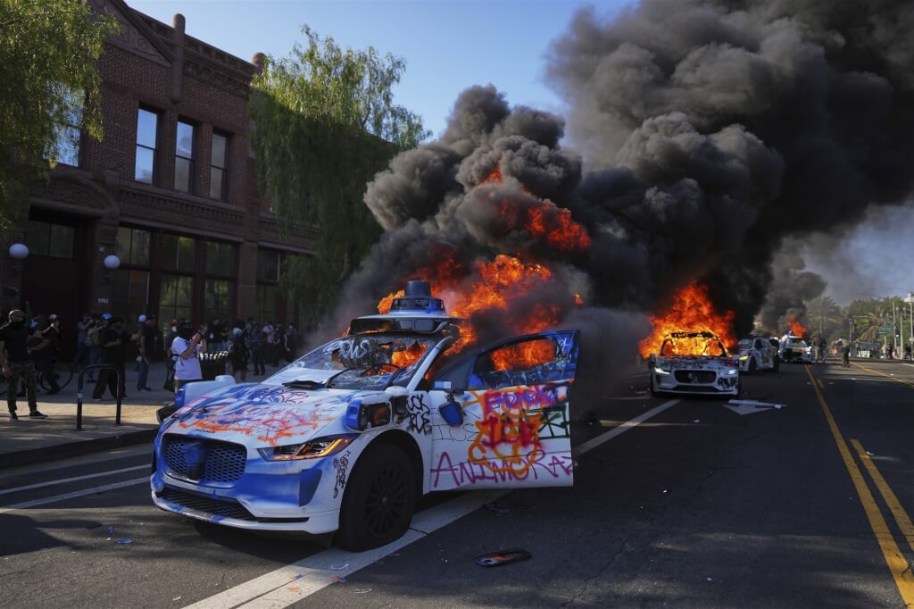 ▲Waymo車遭到示威者襲擊。路透社