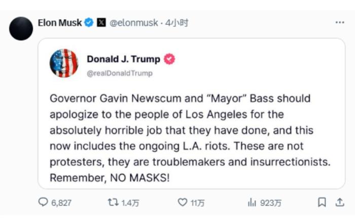 隨后,馬斯克還轉(zhuǎn)發(fā)了多條特朗普在其自創(chuàng)社交平臺上發(fā)布的有關(guān)“洛杉磯騷亂”的帖文和截圖。有分析稱,這表示了馬斯克在該事件中對美國聯(lián)邦政府的聲援。