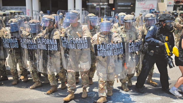 ▲加州國(guó)民兵在抗議聯(lián)邦移民清查活動(dòng)中攜帶盾牌。 (路透)