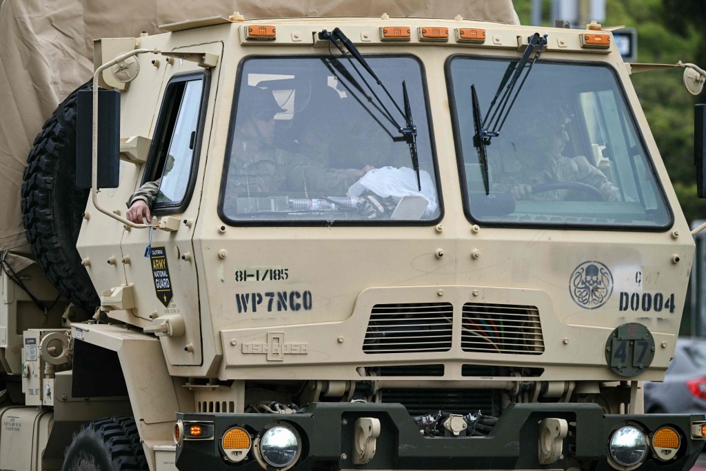 ▲國民警衛(wèi)隊(duì)車輛在洛杉磯市中心部署。 法新社
