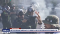 示威者周一在洛杉磯的聯(lián)邦大樓前,與國(guó)民警衛(wèi)隊(duì)員、警察對(duì)峙。