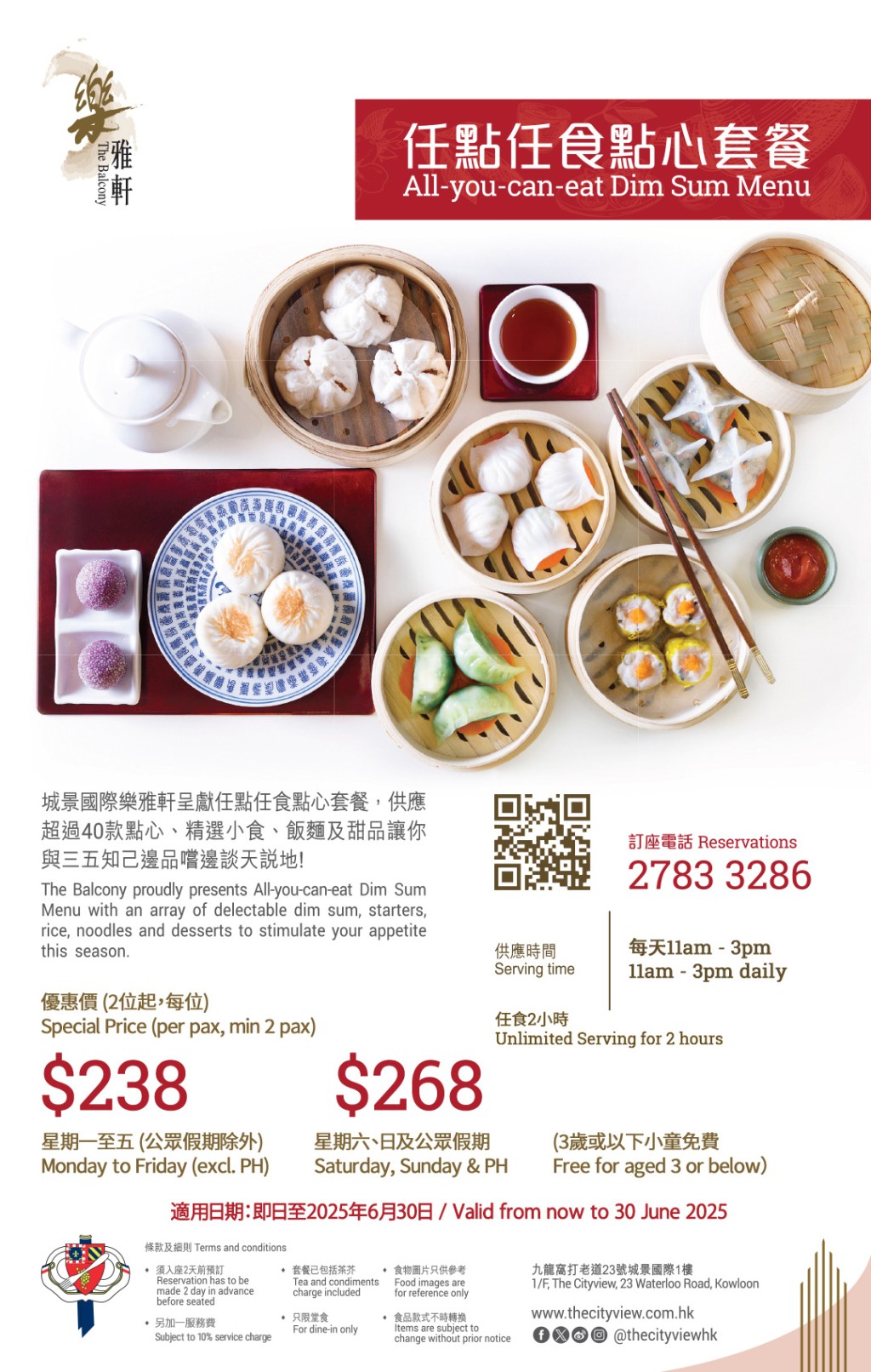 城景國際 theCITYVIEW中菜餐樂雅軒推出2小時“任點任食點心套餐”,供應(yīng)超過40款點心、精選小食、飯面及甜品?,F(xiàn)時,只要經(jīng)城景國際網(wǎng)店預(yù)訂,低至$238/位即可享用點心放題,價錢已包括茶芥,需另付加一服務(wù)費(fèi)。不妨趁假日家人邊品嘗點心邊樂聚天倫!
