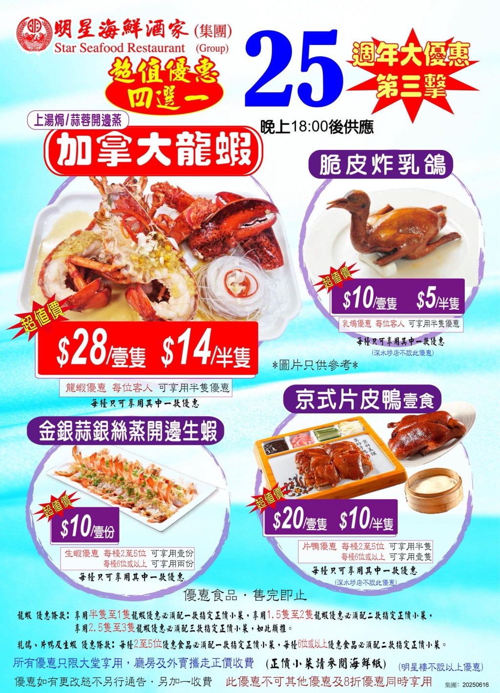 明星海鮮酒家晚市優(yōu)惠!龍蝦/乳鴿/片皮鴨$5起