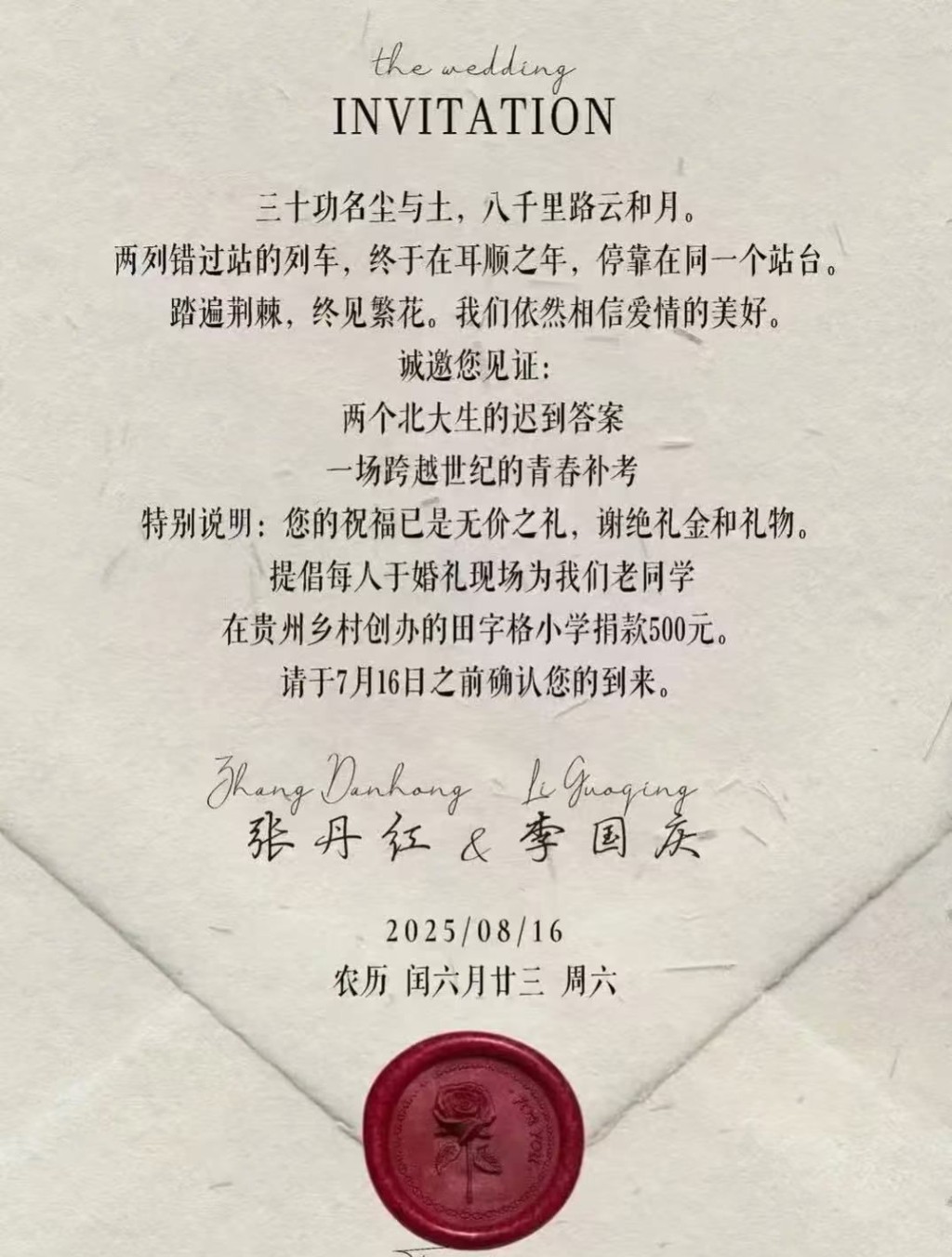網(wǎng)傳結(jié)婚請(qǐng)柬寫道:“兩列錯(cuò)過(guò)站的列車,終于在耳順之年,停靠在同一個(gè)站臺(tái)。踏遍荊棘,終見繁花?!被槎Y謝絕禮金和禮物,提倡每人于婚禮現(xiàn)場(chǎng)向貴州田字格小學(xué)捐款500元。