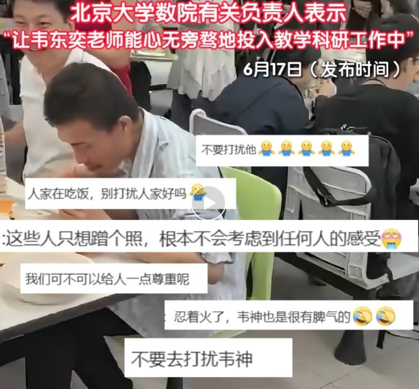 畫面中,不少圍觀者湊到其身邊拍照、合影,還有人問身邊人“拍到了嗎”,而韋東奕對(duì)此并未理會(huì),依舊專心吃飯。