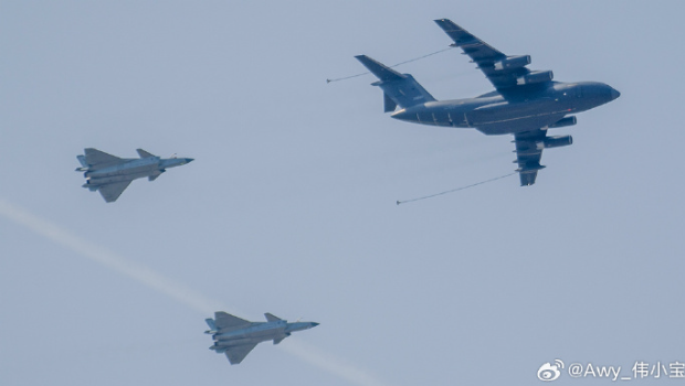 運(yùn)油-20和殲-10C編隊(duì)飛行。