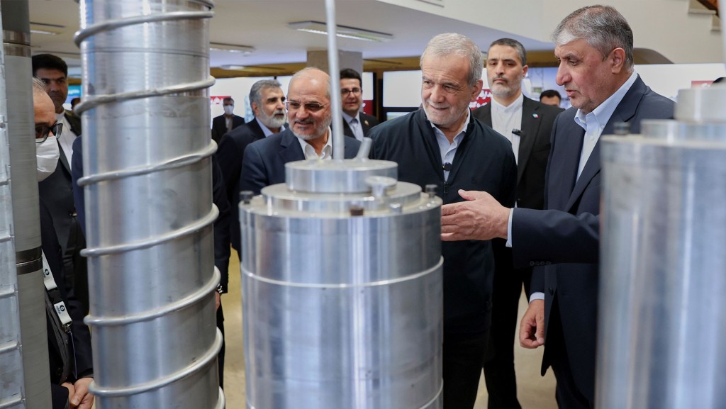 伊朗總統(tǒng)佩澤什基安在伊朗德黑蘭參觀伊朗核成就展覽。 美聯(lián)社