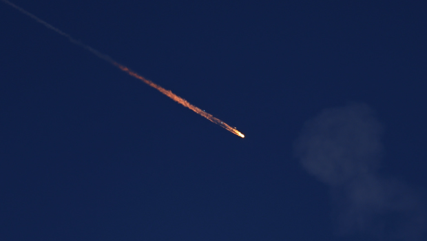 一枚碎片從空中墜落,在以色列與伊朗沖突期間,以色列“鐵穹”系統(tǒng)攔截來自伊朗的導(dǎo)彈后可見此景。