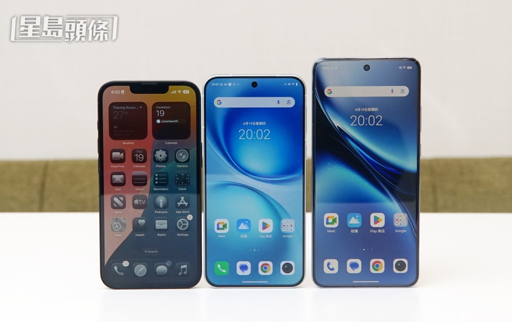 6.31吋的X200 FE(中)機身比6.78吋的X200 Pro(右)短小一截,屏幕則比iPhone 16e(左)的6.1吋大一點。.jpg