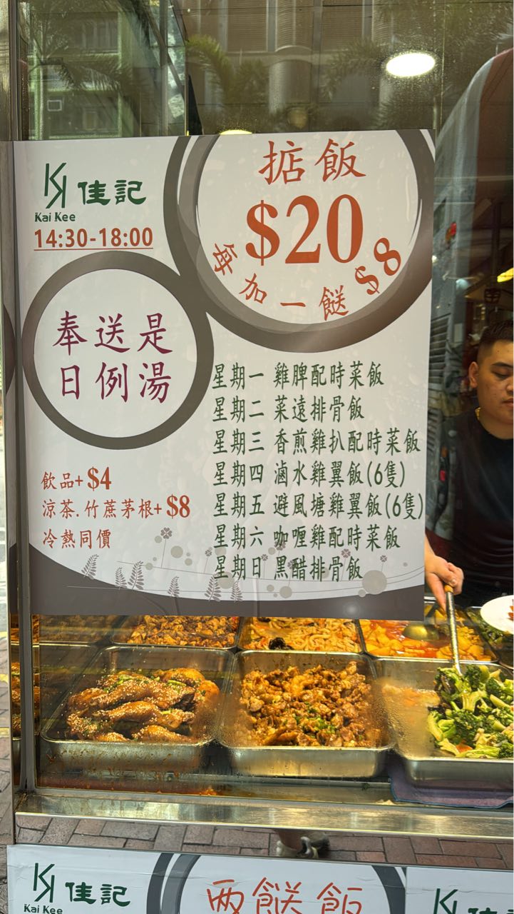 佳記于每日下午兩時半至六時期間推出$20“掂飯”優(yōu)惠,提供多種款式,菜式每日更換,包括“雞脾配時菜飯”、“香煎雞扒配時菜飯”、“避風(fēng)塘雞翼飯(6只)”等,分量充足且不因價格降低而打折扣。 食客可選擇$8 再加一款餸,以及加 $4 配飲品,冷熱同價。