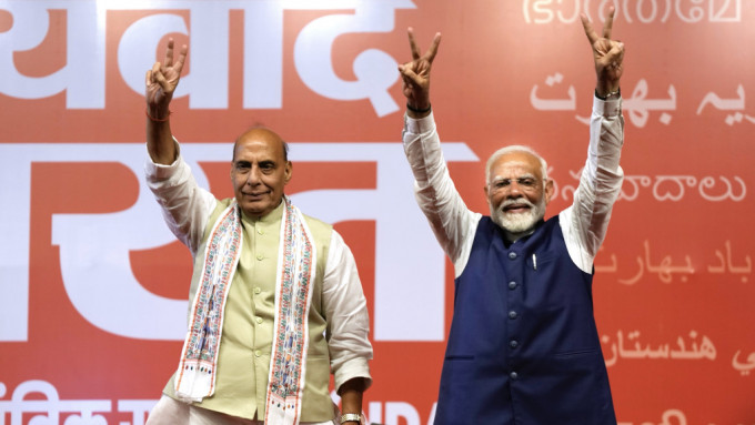 莫迪(右)與防長辛格一同在印度人民黨(BJP)總部慶祝勝選。 美聯社