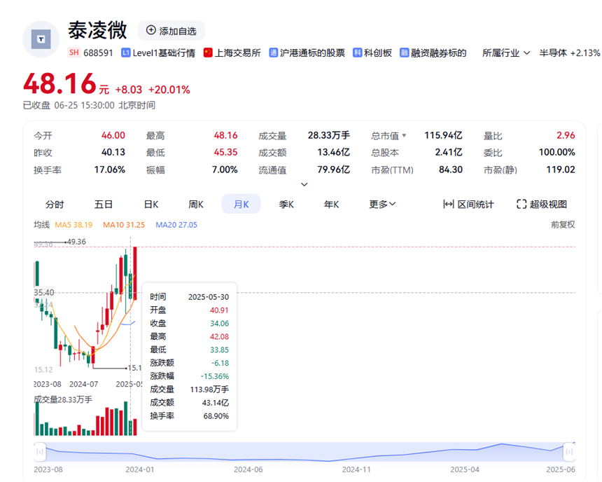 值得一提的是,泰凌微2025年第一季度業(yè)績說明會后,連續(xù)發(fā)布一系列利好消息,股價一路狂飆。5月30日報收34.06元,截至6月25日,收報48.16元,創(chuàng)今年新高。6月漲幅超41.4%。