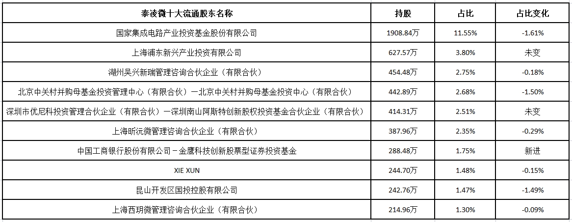 截至今年三月底,泰凌微前十大流通股東里面,七個減持,僅一家新進,為中國工商銀行股份有限公司-金鷹科技創(chuàng)新股票型證券投資基金,持股是288.48萬,占比1.75%。
