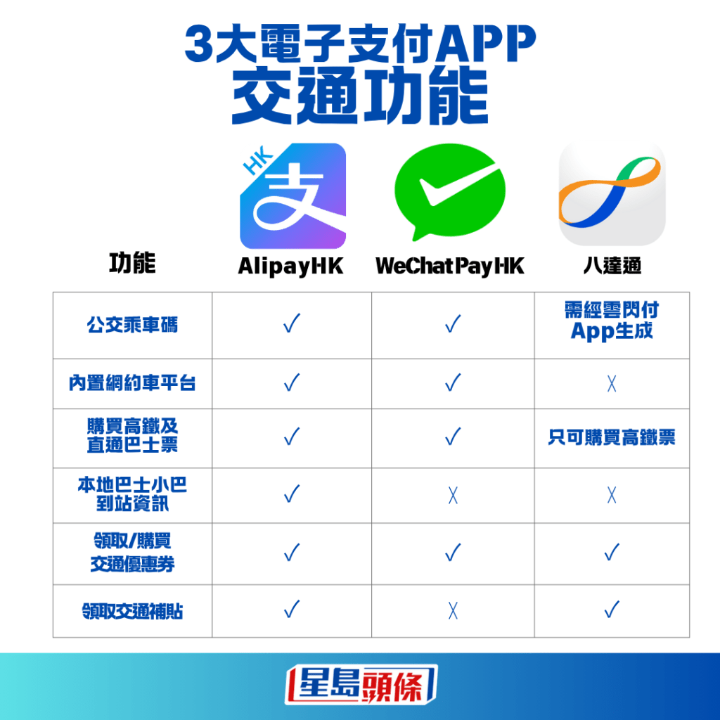 北上Call車,三大電子支付工具AlipayHK、WeChat Pay HK及八達(dá)通,哪一款服務(wù)最齊? 未到暑假,不少港人已一家大細(xì)北上親子游,即使不是長假期,單是上周末(21日及22日)兩日各大口岸出入境也大排長龍,據(jù)政府?dāng)?shù)字該兩日出入境總?cè)舜胃哌_(dá)230萬,當(dāng)中港人出境人次占近84萬。 一家人北上游玩,最方便當(dāng)然是電召一輛六座商務(wù)車,點(diǎn)對點(diǎn)玩遍深圳大型商場及景點(diǎn),小朋友到老人家坐得舒服之余,又方便擺放行李及戰(zhàn)利品。 《星島頭條》比較三大常用的電子支付工具AlipayHK、WeChat Pay HK及八達(dá)通,比較哪一個(gè)平臺覆蓋最廣。