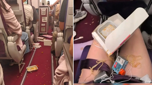 飛機遇上晴空顛簸后,食物和雜物散滿一地。微博@《南方日報》