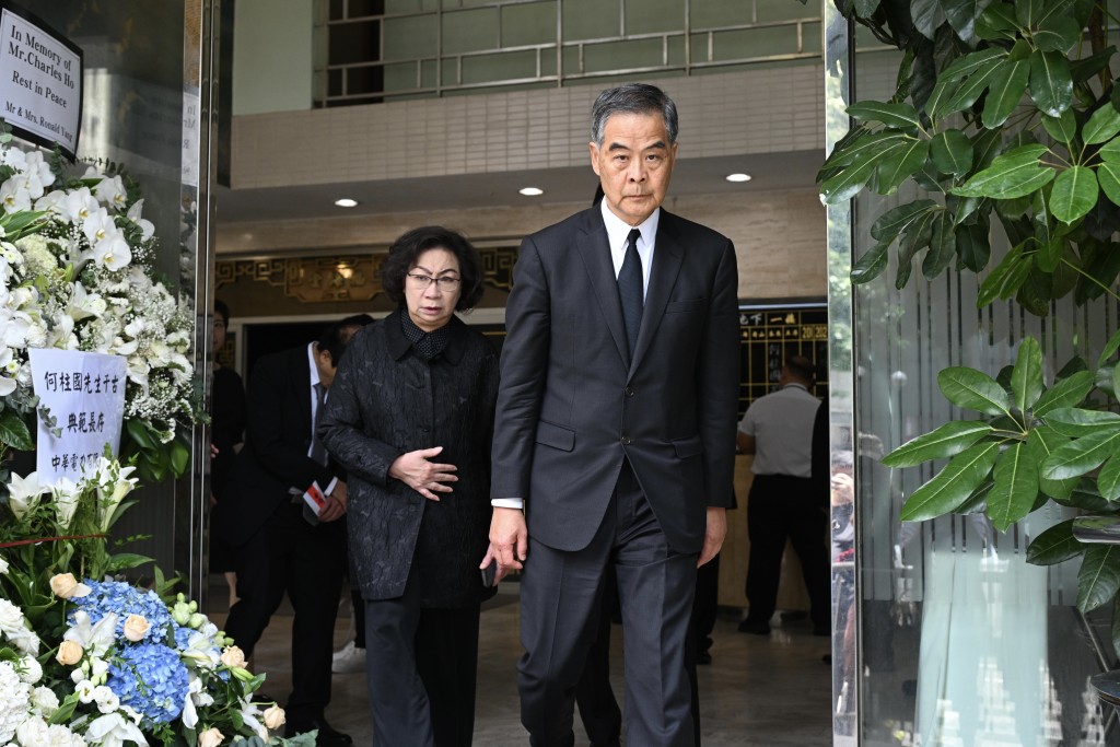 ▲大殮儀式有多位政商界人士到場。圖為全國政協(xié)副主席、前特首梁振英伉儷。